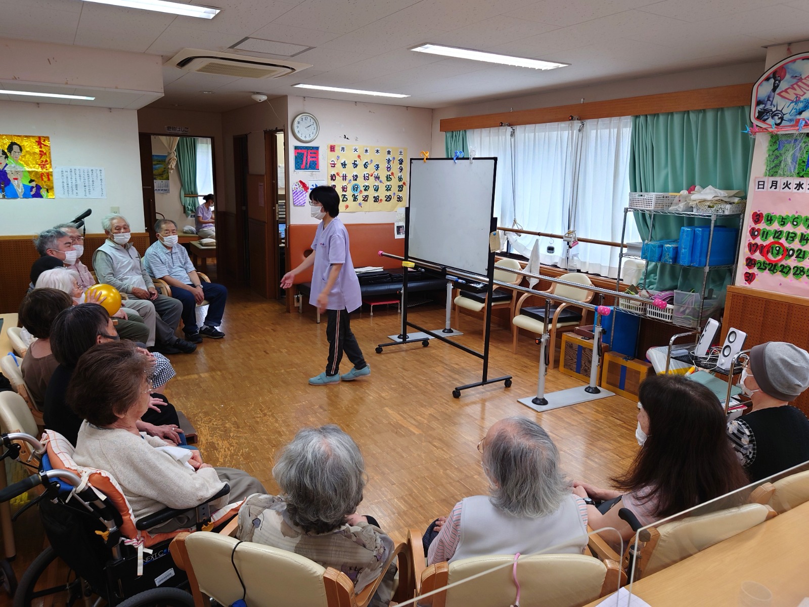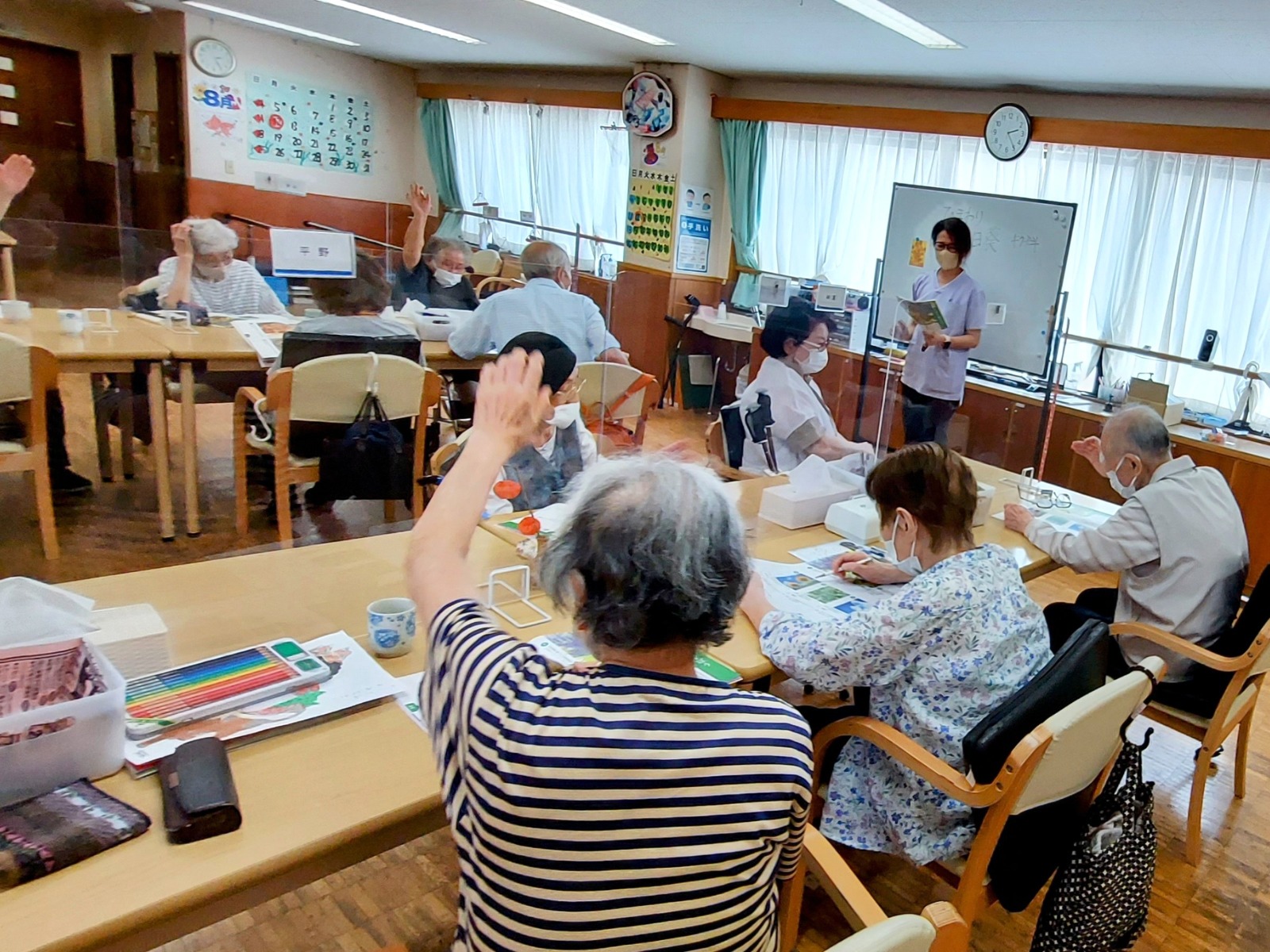毎月届く高齢者向けの教科書(自費)を用いて、脳の活性化(見る・聞く・話す・書く・考える)を図る授業形式です。何か古いものを見たり、思い出話をしたりして「懐かしい!」と思う回想法を活用して認知機能を高めます。利用者様が思い出話で盛り上がり、笑いとおしゃべりでイキイキとした時間が過ごせます。